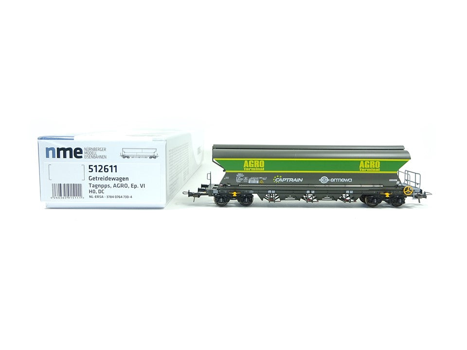 4-achsiger Getreidewagen Tagnpps 101m³ als Privatwagen der Firma AGRO in dunkelgrau. Betriebsnummer 3784 0764 730-4. Epoche VI,Das nme-Modell ist ein hochwertiges Modell mit vielen extra angesetzten Teilen. Highlights sind unter anderem die bis ins Detail nachgebildete Dachmechanik an den Stirnfronten des Wagens sowie die fein gearbeitete Auslassmechanik am Wagenboden. Natürlich verfügt auch dieses Modell wieder über die bekannt guten Laufeigenschaften und wird in kleinen Auflagen mit jeweils geänderten Wagennummern ausgeliefert werden.