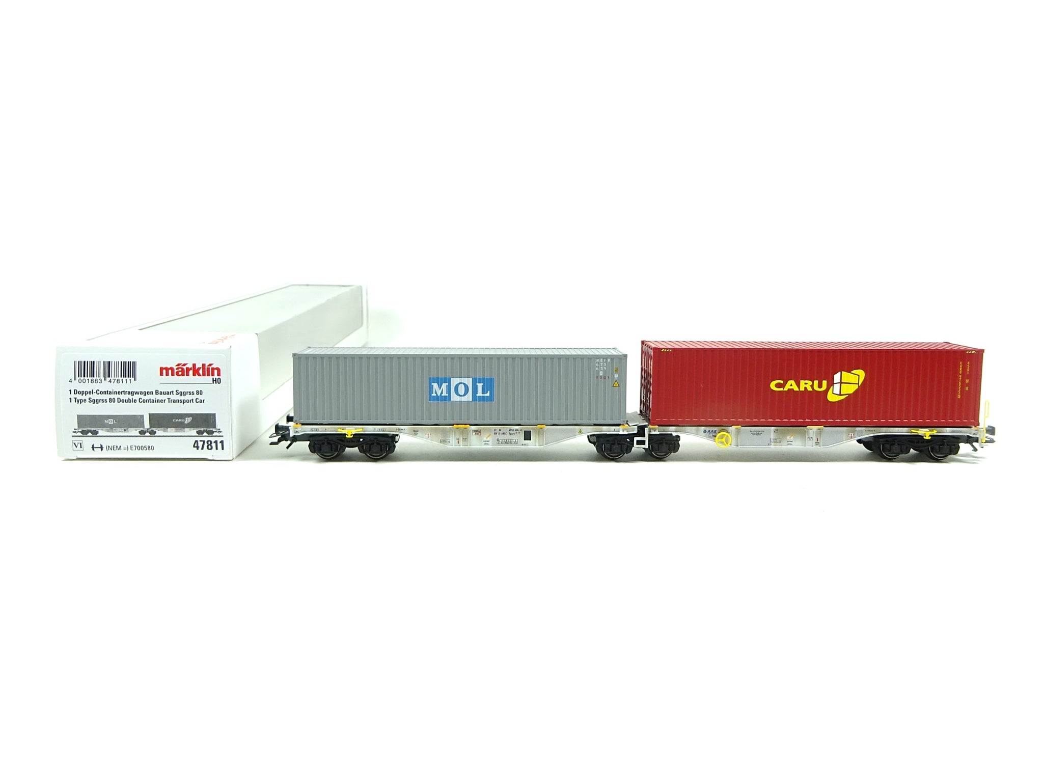 Modell: Vorbildgerecht durchbrochene Tragwagen-Böden aus Metall, mit markanten fischbauchartigen Außenlangträgern. Drehgestelle Typ Y 25. Beide Tragwagen-Hälften liegen beweglich gelagert auf dem mittleren Drehgestell auf. Unterseite der Tragwagen-Böden mit angesetzten Bremsleitungen und Luftbehältern. Klappbare Übergänge an der Oberseite der Tragwagen-Böden über dem mittleren Drehgestell im Gelenk-Bereich. Separat angesetzte Haltestangen an den Wagenenden und Rangierhaken. Beladen mit einem 40-ft. High-Cube Boxcontainer und einem normal hohen 40-ft. Boxcontainer, beide zum Abnehmen.