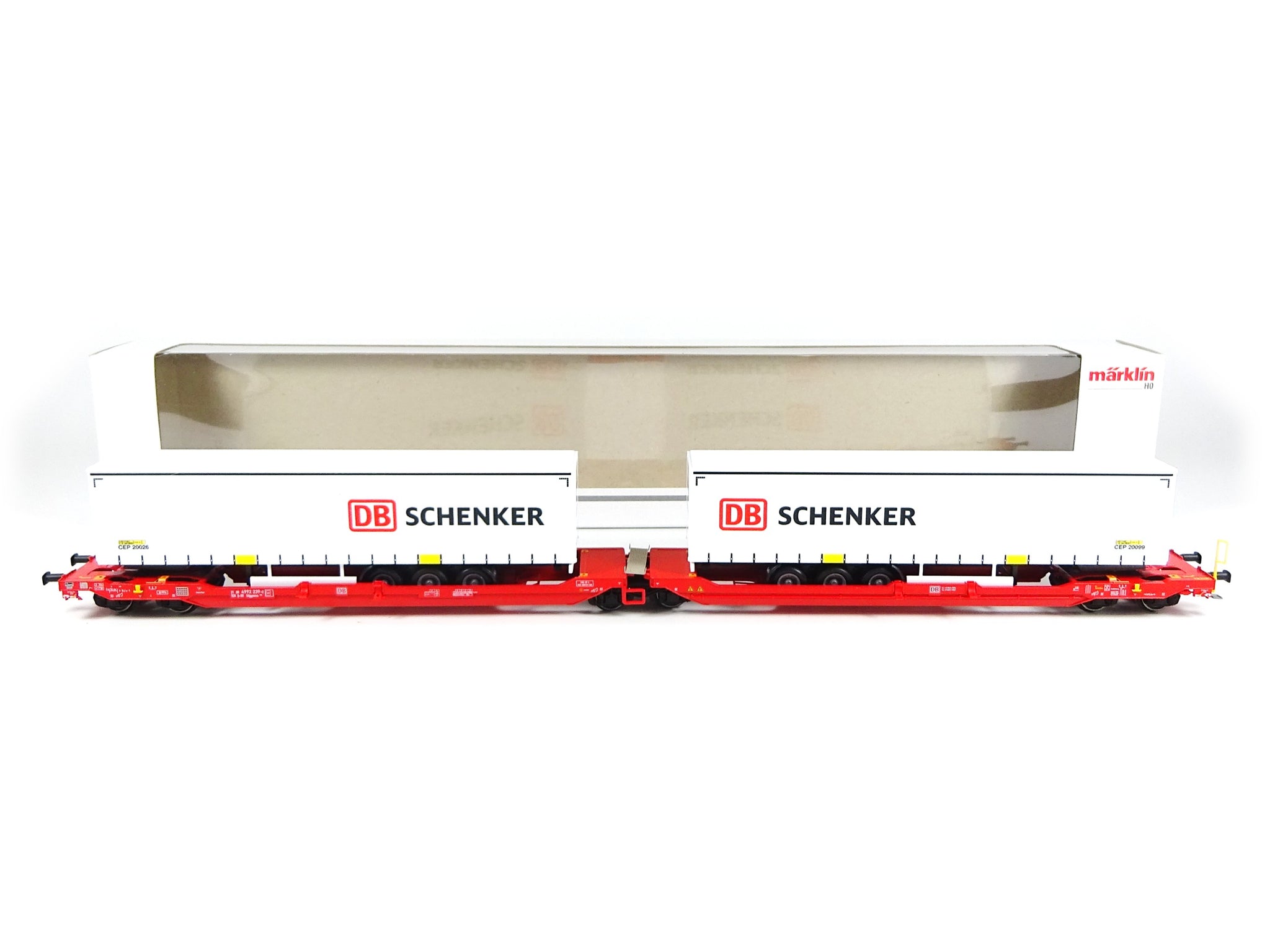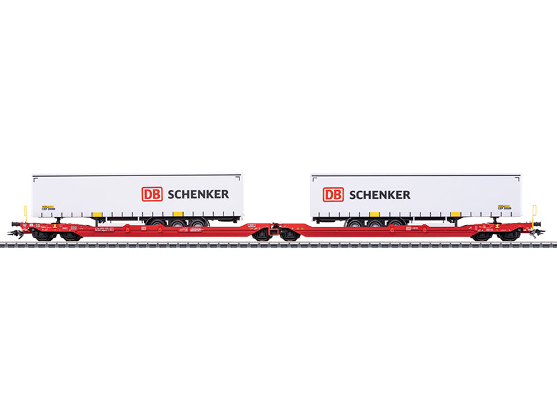 Modell: Beide Tragwagenhälften aus Metall, beweglich gelagert auf dem mittleren Drehgestell. Seitliche Klappriegel ab Werk montiert. Hochklappbar für den Transport von Containern oder Wechselbrücken. Viele separat angesetzte Details wie Übergangsrost, Tritte, Bremsleitungen und Haltestangen an den Wagenenden. Drehgestelle Bauart Y25. Pufferhöhe nach NEM. Aufnahme für Stützbock, Halterungen für Königszapfen in hoher und niedriger Ausführung, Rangiertritte und Luftkessel für die Wagenenden liegen als separat ansteckbare Teile bei. Beladen mit zwei Gardinenplanen-Sattelaufliegern der Spedition DB Schenker.