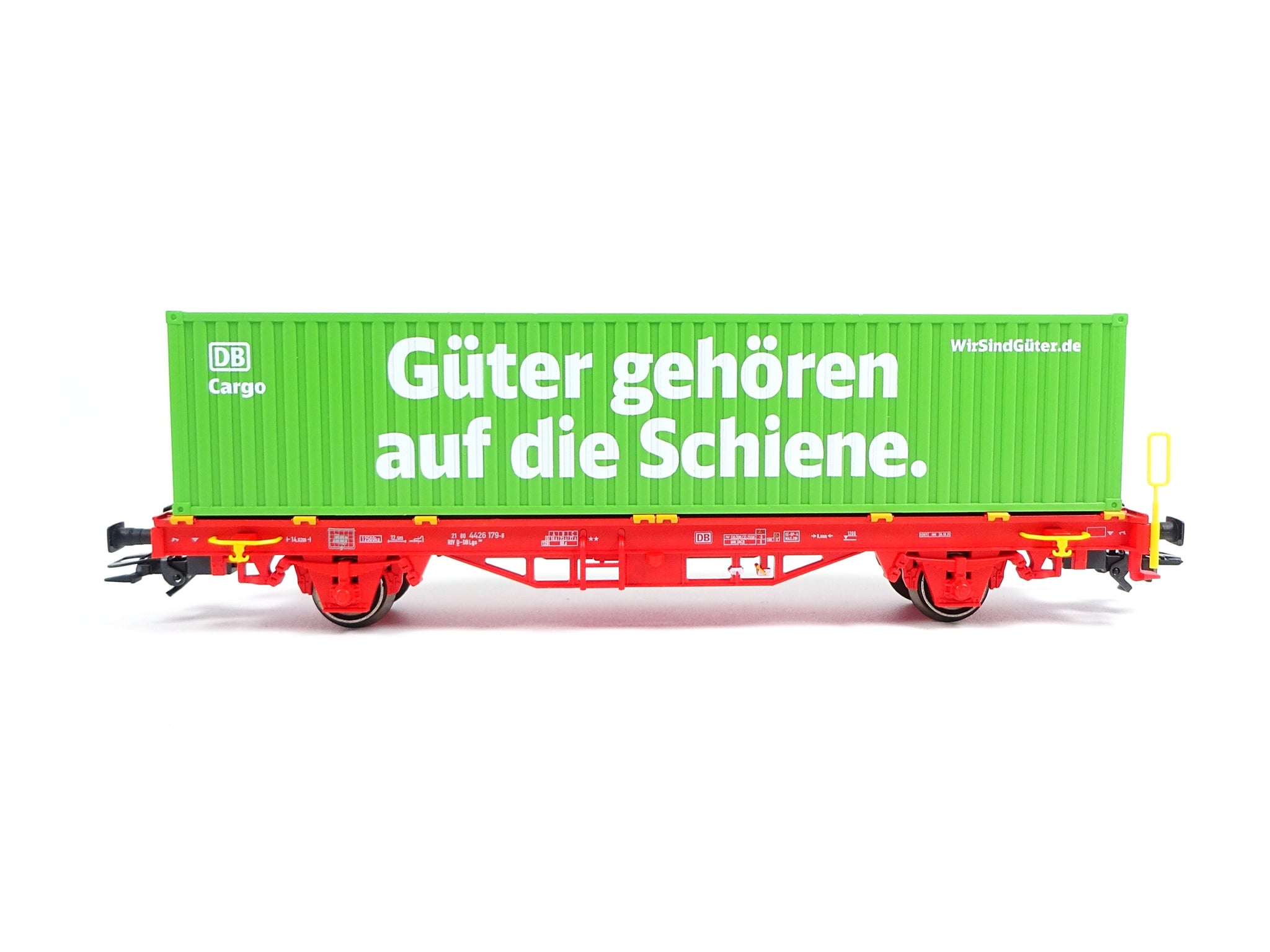 Modell: Tragwagen mit Darstellung des Riffelbleches als Abdeckblech am Wagen-Aufbau. Bei den Rangiertritten jeweils angesetzter Haltebügel im aufgerichteten Zustand. Am Längsträger angesetzte Aufstiegsleiter und Seilanker mit Schutzrohren. Ausführung ohne Handrad für bodenbedienbare Feststellbremse. Beladen mit 40-ft.-Boxcontainer zum Abnehmen.