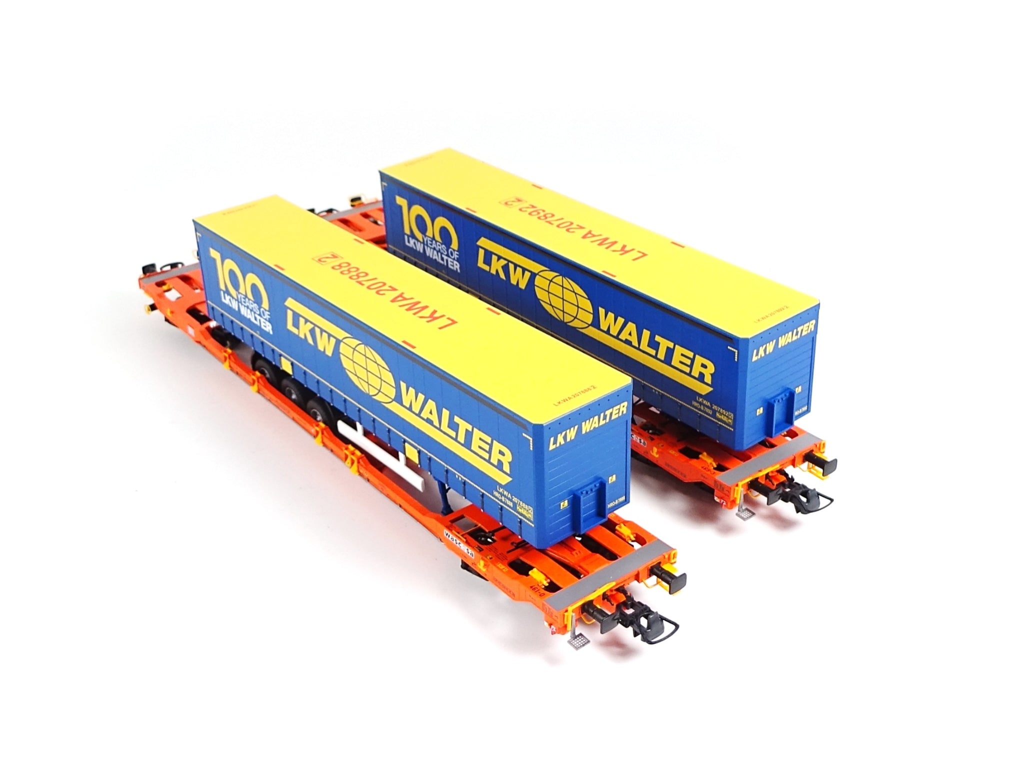 Vorbild: Wagenset mit zwei Taschenwagen, Gattung Sdgnss/T5 der Wascosa. Epoche VI