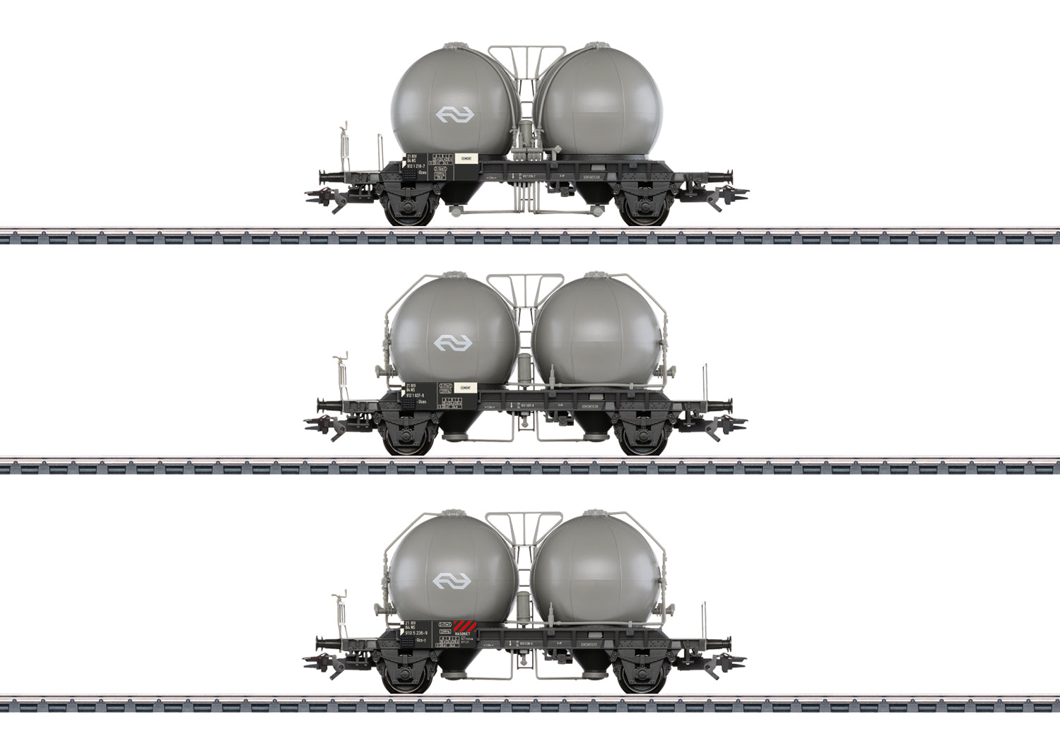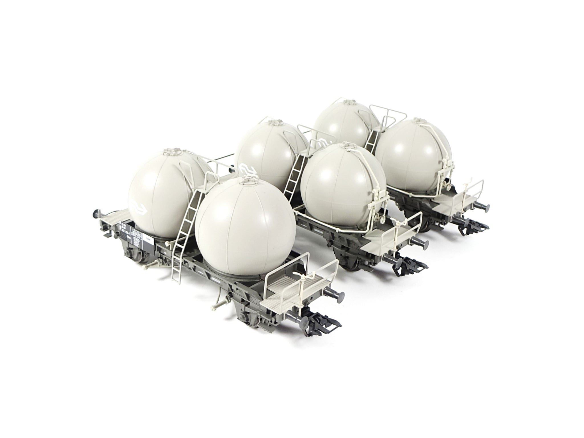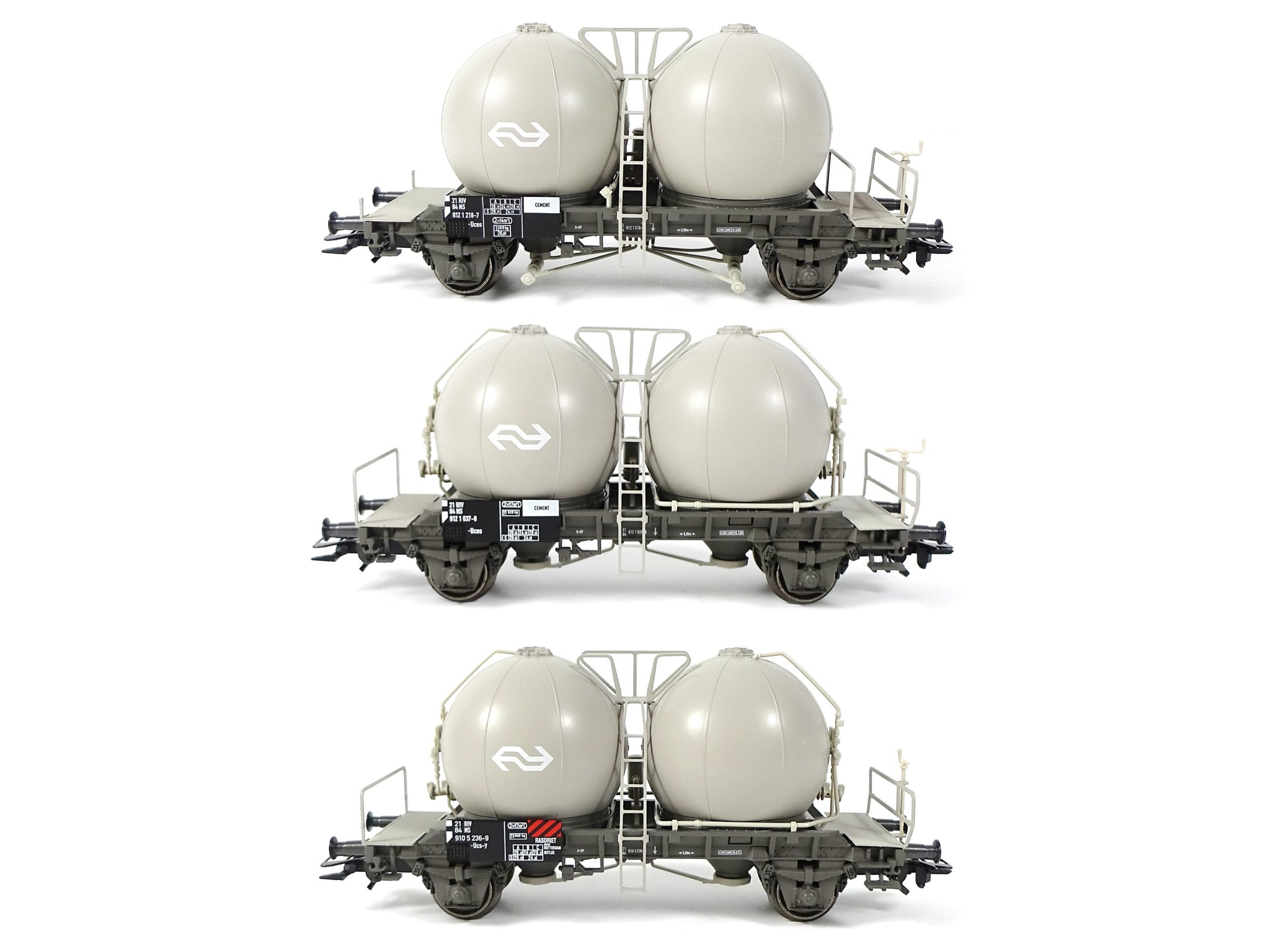 Vorbild: 3 zweiachsige Kugelbehälterwagen Typ Uces und Ucs-y der Niederländischen Eisenbahnen (NS). Wagen mit je 2 Behältern zum Transport von Zement. Beschriftet mit dem Logo der Niederländischen Staatsbahnen. Alle Wagen im Betriebszustand um 1970. Epoche IV
