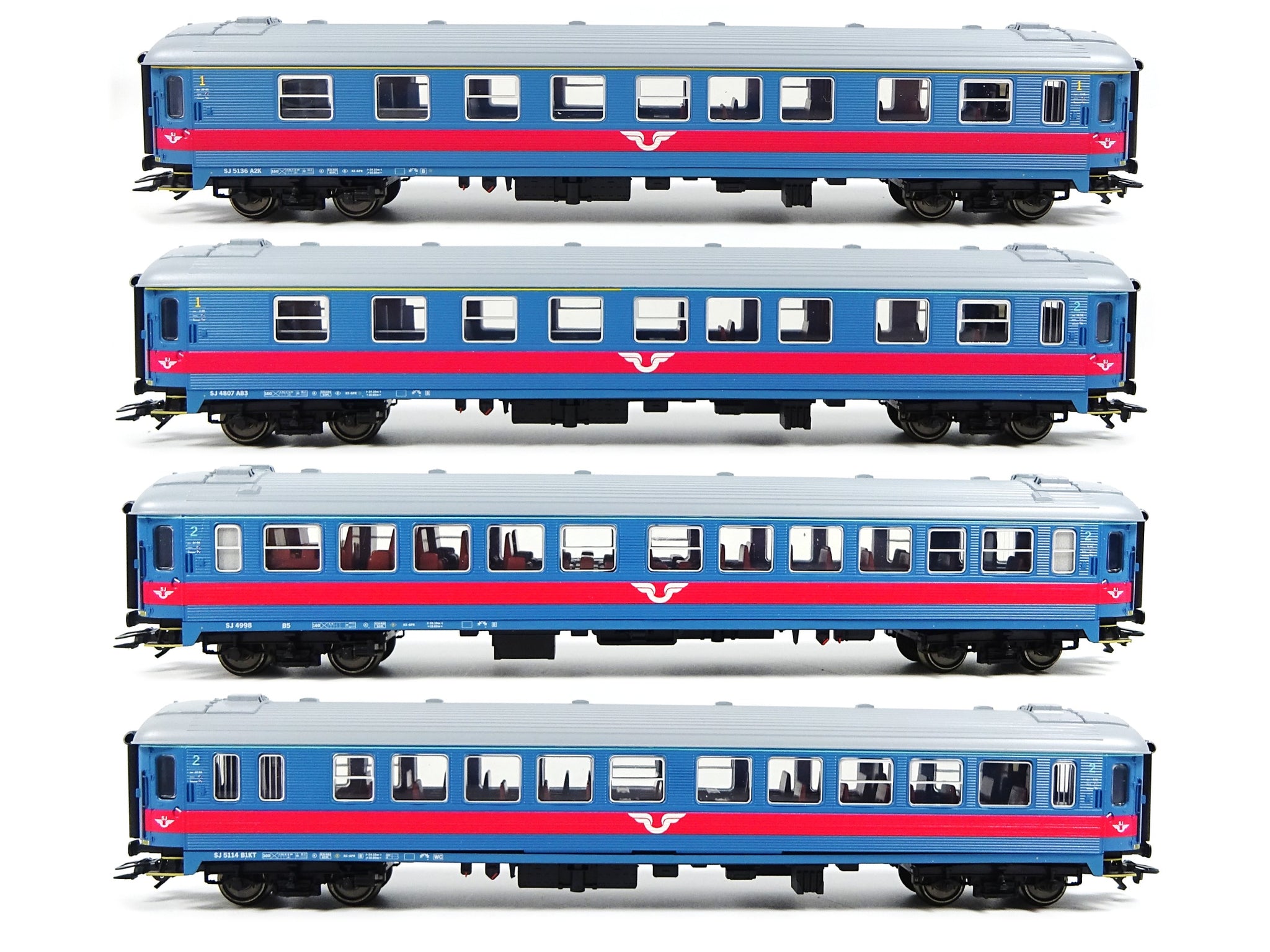 Vorbild: Inter-Regio-Zug der Schwedischen Staatsbahnen (SJ): Typ A2K 1. Klasse, Typ AB3K 1. und 2. Klasse, Typ B1KT 2. Klasse und Typ B5K 2. Klasse. Epoche V