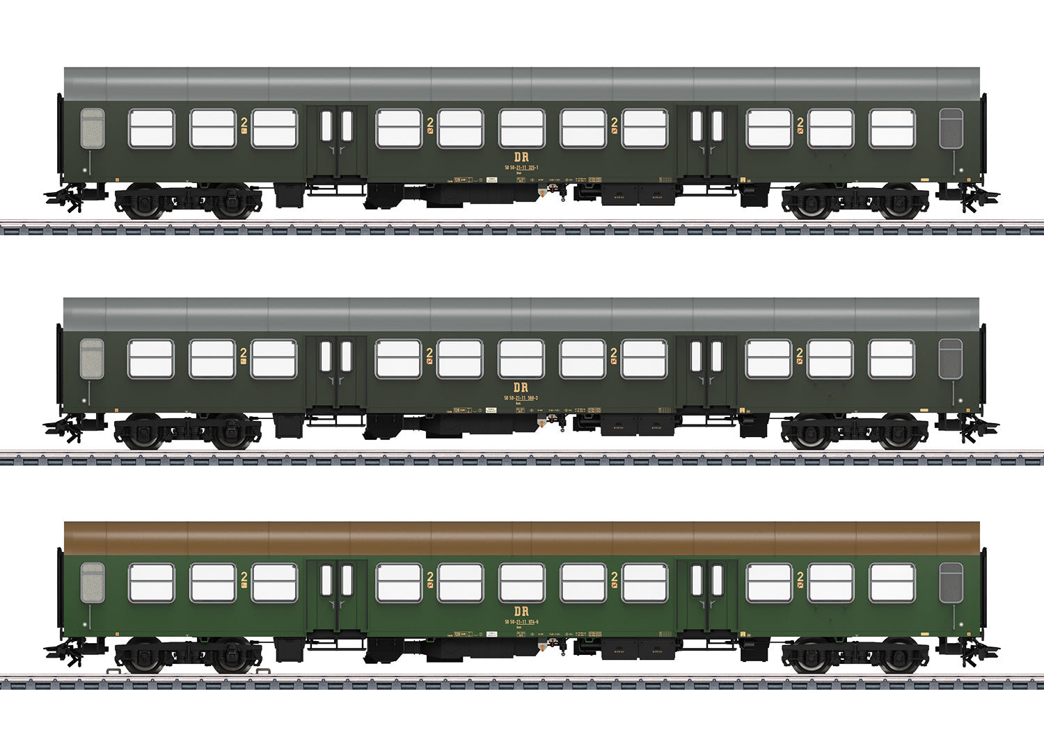 Vorbild: Drei Personenwagen Bauart Bmh, 2. Klasse, der Deutschen Reichsbahn (DR/DDR). Bauart "Halberstädter Mitteleinstiegswagen". Zwei Wagen in dunkelgrüner (TGL 2233) und ein Wagen in chromoxidgrüner (TGL 2235) Grundfarbgebung. Betriebszustand Ende der 1980er-Jahre. Epoche IV