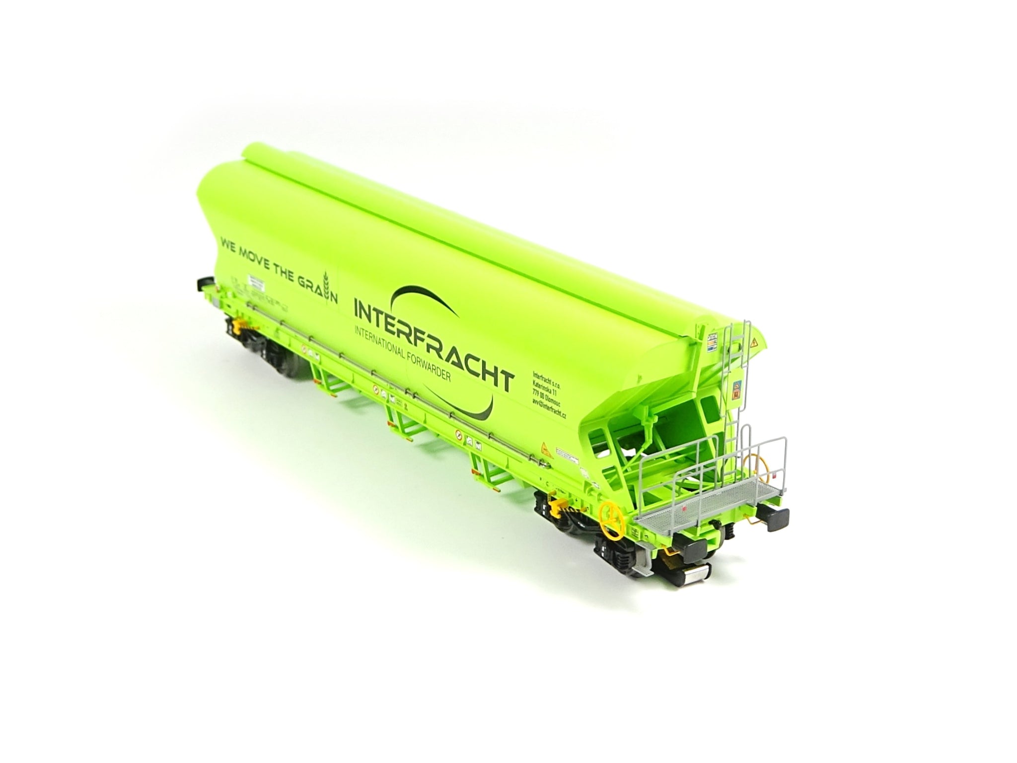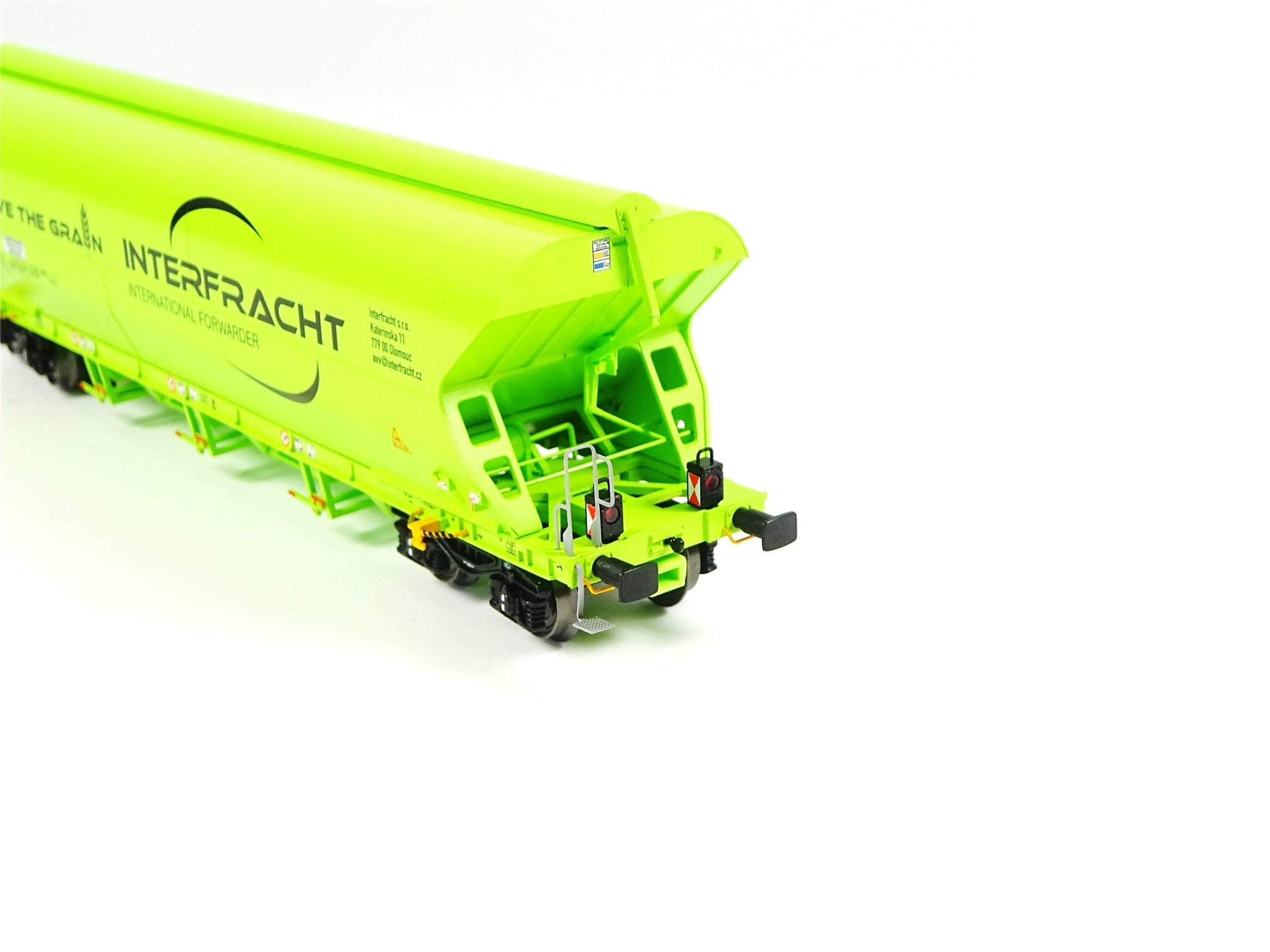 4-achsiger Getreidewagen Tagnpps 101m³ Interfracht, neongrün, mit Zugschlussbeleuchtung DE