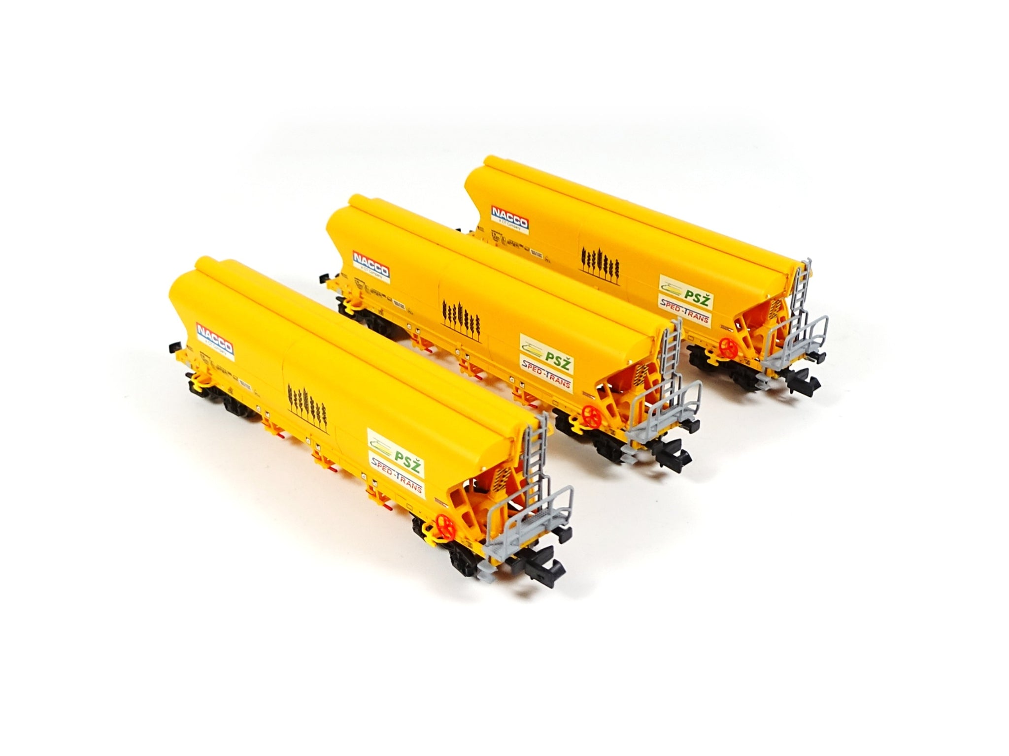 3x 4-achsiger Getreidewagen Tagnpps 101m³ 'PSZ-SpedTrans' NACCO, Epoche VI.