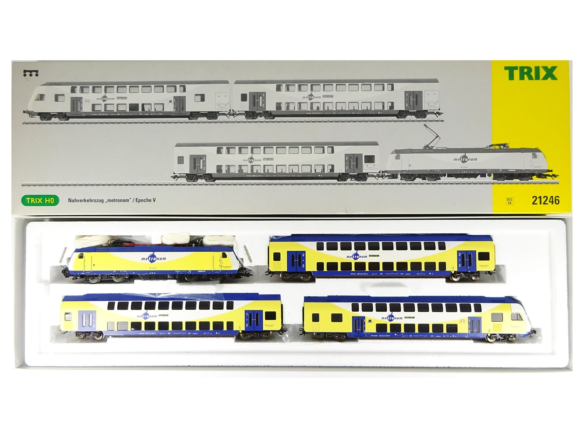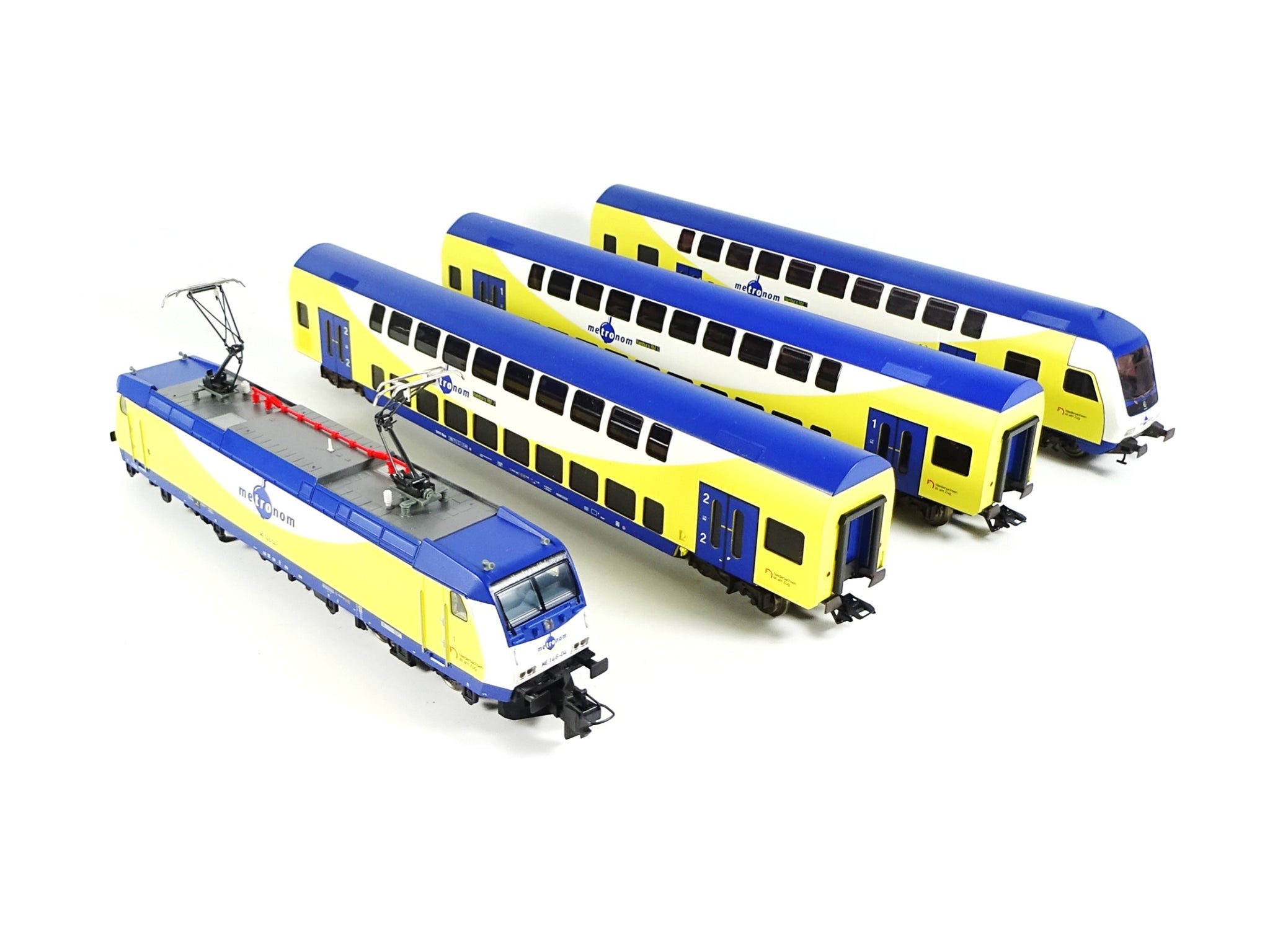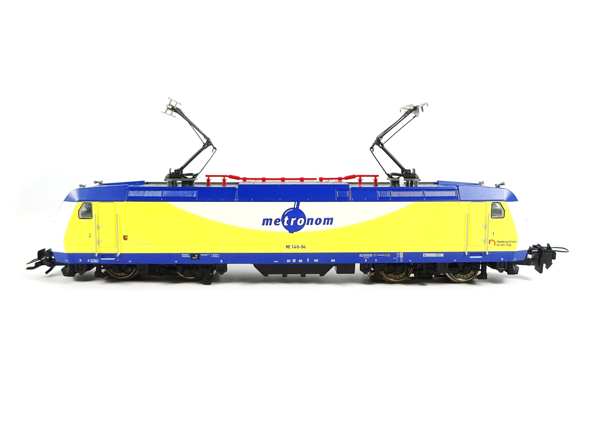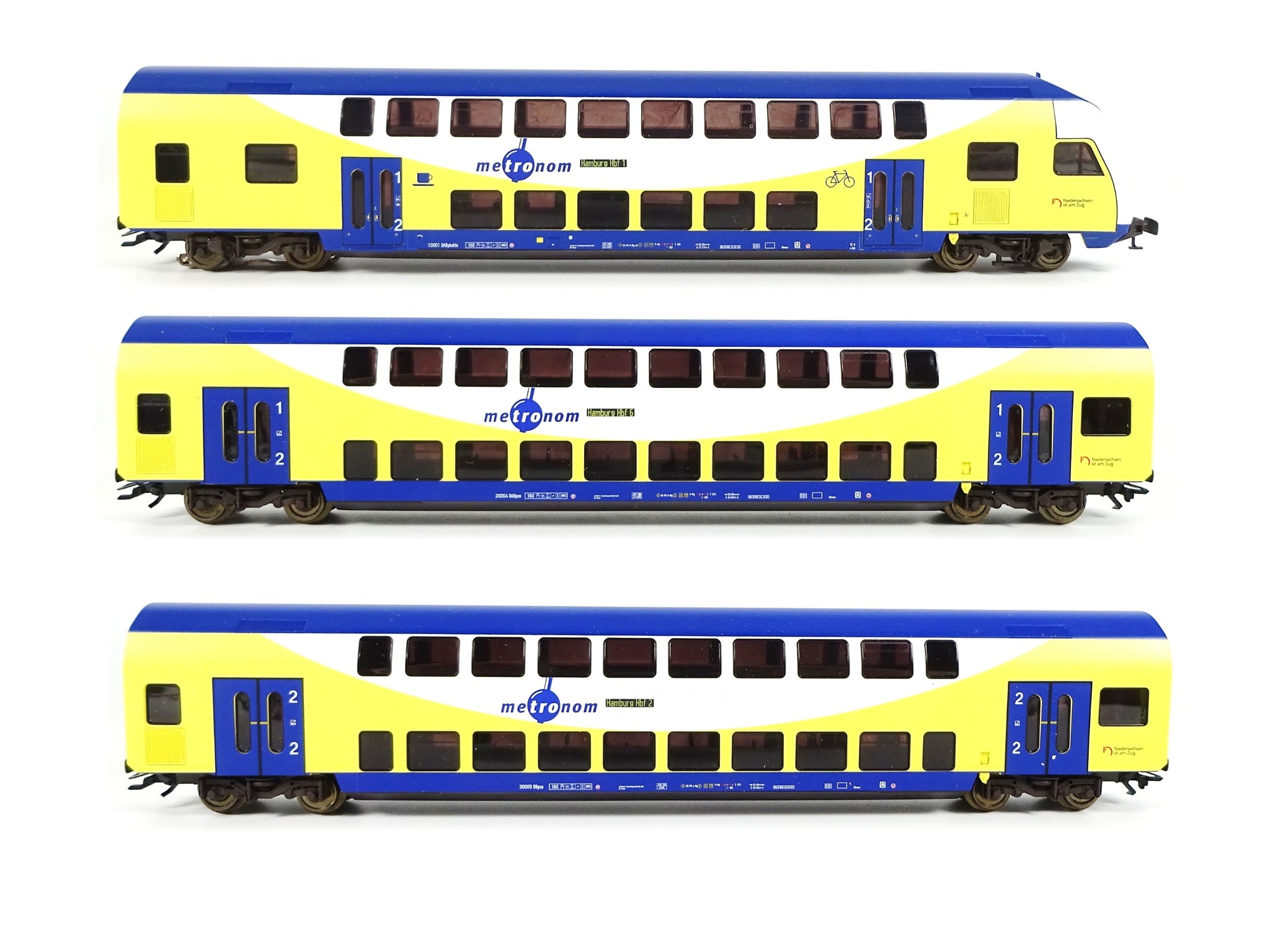 Vorbild: Fahrzeuge aus dem aktuellen Personenverkehr. Elektrolokomotive Baureihe 146.1 sowie Doppelstock-Personenwagen und Doppelstock-Steuerwagen Bauart Görlitz der "metronom" Eisenbahngesellschaft mbH. Epoche V.Modell: Lokomotive mit Fahrgestell und Aufbau aus Metalldruckguss. Eingebauter Digital-Decoder für DCC, Selectrix und Trix Systems, auch konventionell einsetzbar. 4 Achsen angetrieben. 2 Haftreifen. Fahrtrichtungsabhängig wechselndes Dreilicht-Spitzensignal mit wartungsfreien Leuchtdioden. 2 Doppelstock-Personenwagen und 1 Doppelstock-Steuerwagen. Sämtliche Fahrzeuge in aktueller Epoche-V-Gestaltung "metronom". Wagen mit Kupplungsaufnahmen nach NEM und Kinematik für Kurzkupplung.