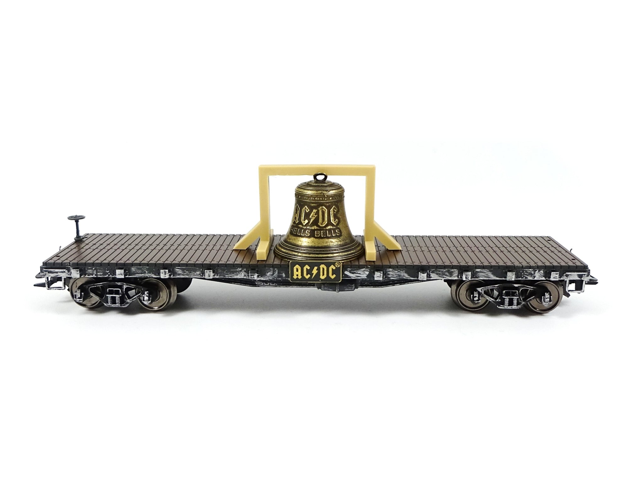 Modell: Flachwagen in Metall-/Kunststoff-Kombination. Wagen-Boden mit separat angesetzten Luftbehältern und Bremsleitungen. Am Wagen-Aufbau Bremsräder und angesetzte Haltegriffstangen. Separat einsteckbare Rungen liegen dem Wagen im Flachbeutel bei. Der Wagen ist mit einer Miniatur der AC/DC "Hells Bells"-Glocke beladen. Zur Fixierung liegt ein passendes Ladegestell bei. Kulissengeführte Kupplungsdeichseln mit NEM-Normschacht.