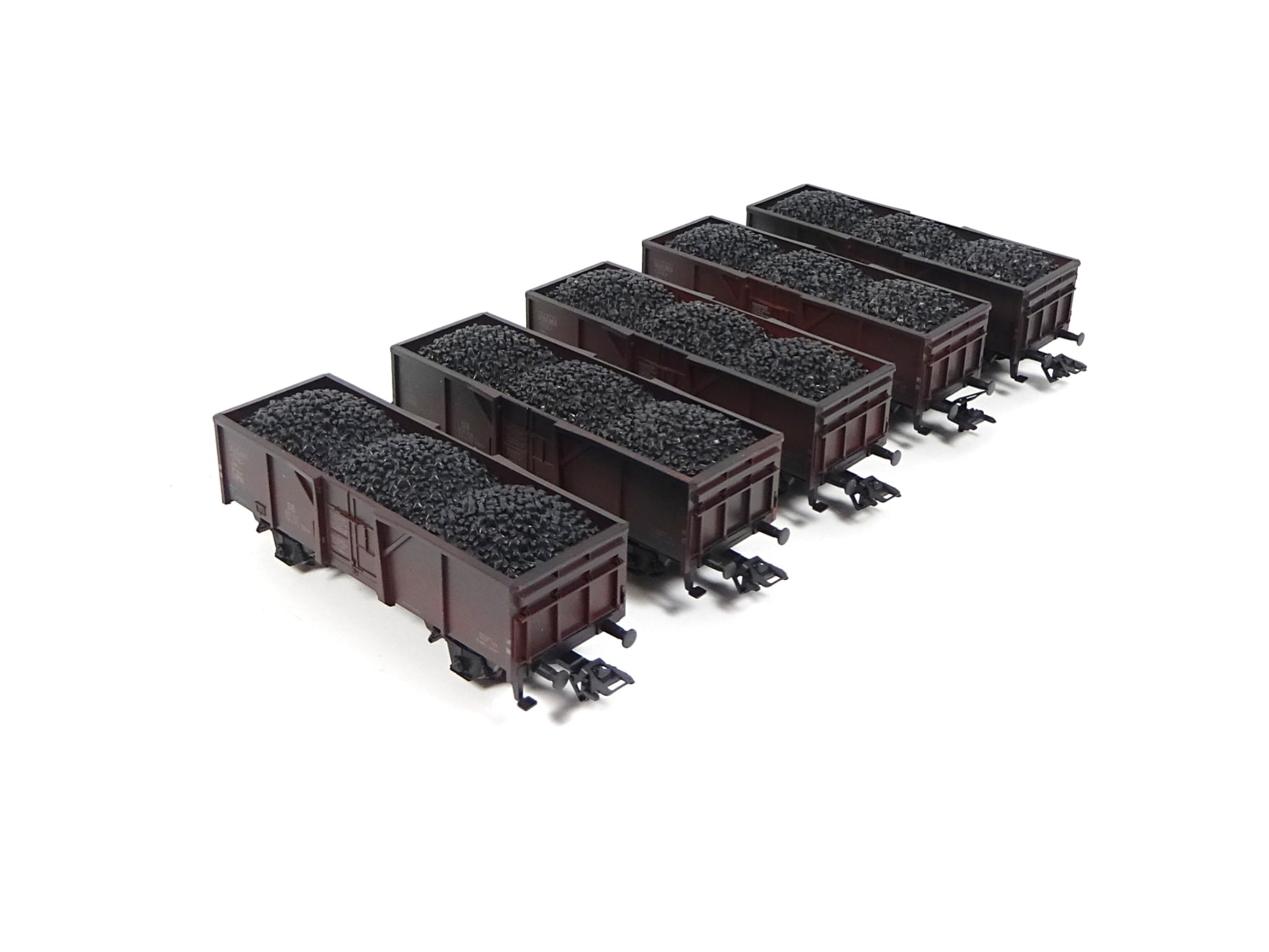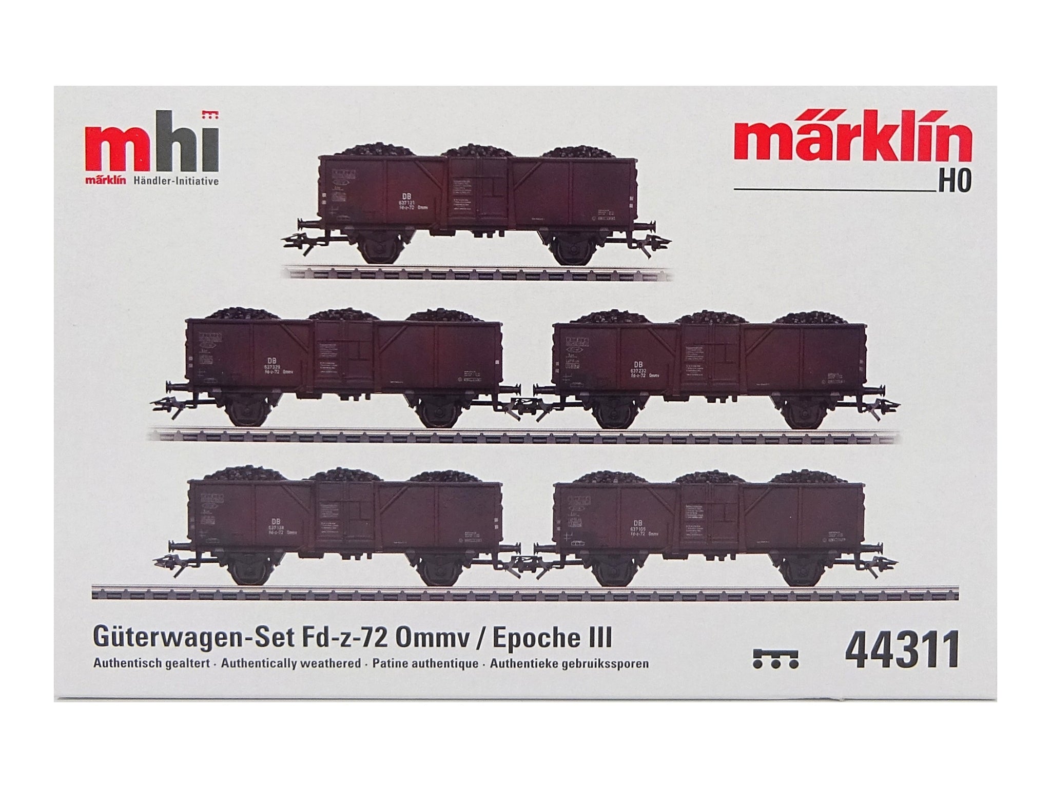 Vorbild: Mittenselbstentladewagen Fd-z-72 Ommv (späterer El-u 061). Fünf Mittenselbstentladewagen mit Steinkohlebeladung und betriebsgerechter Alterung, wie sie in den 1950er- und 1960er-Jahren des vorigen Jahrhunderts oft im Güternahverkehr zu sehen waren. Ihr Vorteil waren die schnelle und preisgünstige Entladung der Steinkohle beim Kleinempfänger. Epoche III