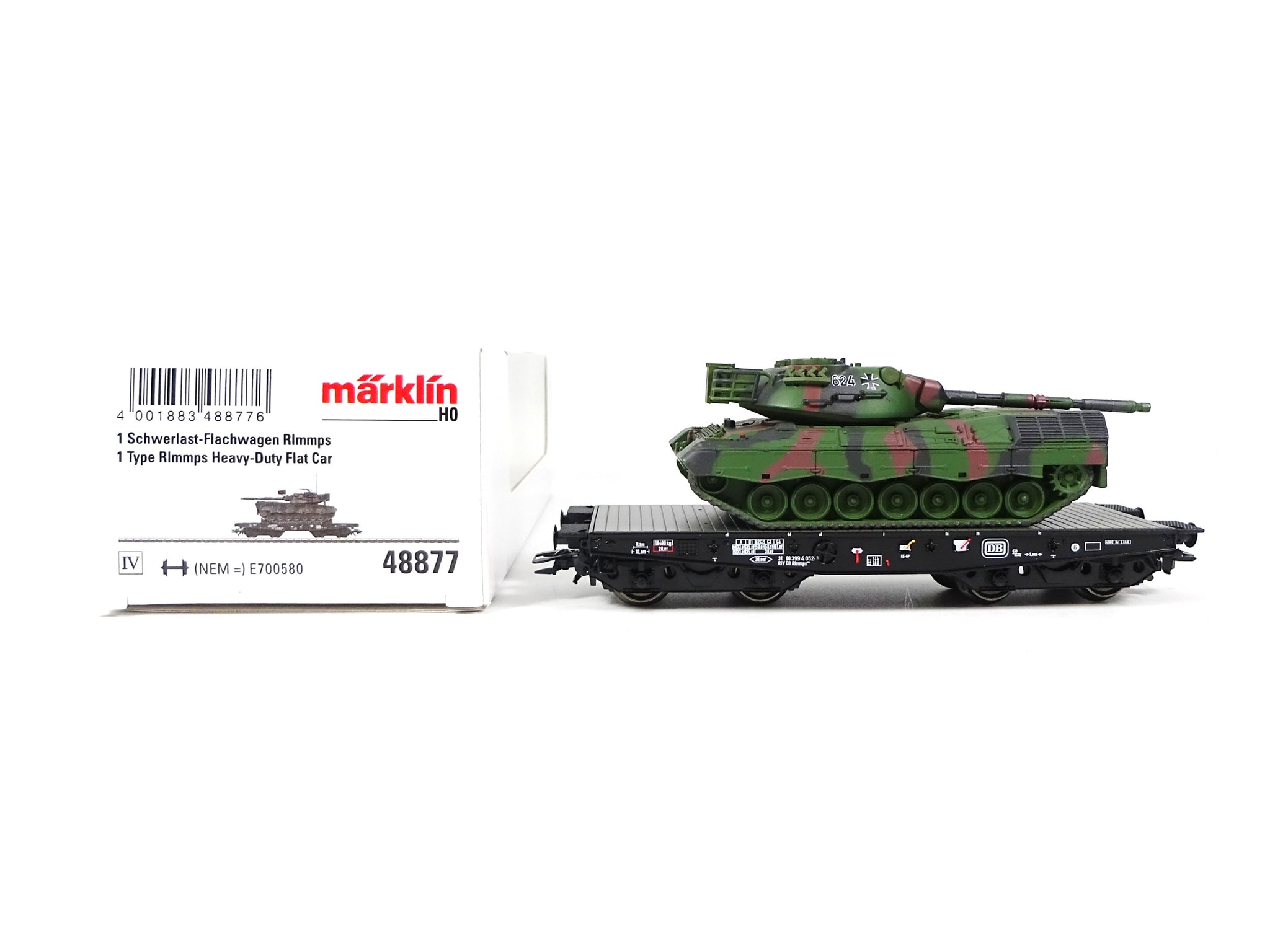 Vorbild: Schwerlast-Flachwagen Bauart Rlmmps 650 der Deutschen Bundesbahn (DB), beladen mit einem Kampfpanzer Leopard 1A1 der Deutschen Bundeswehr. Epoche IV