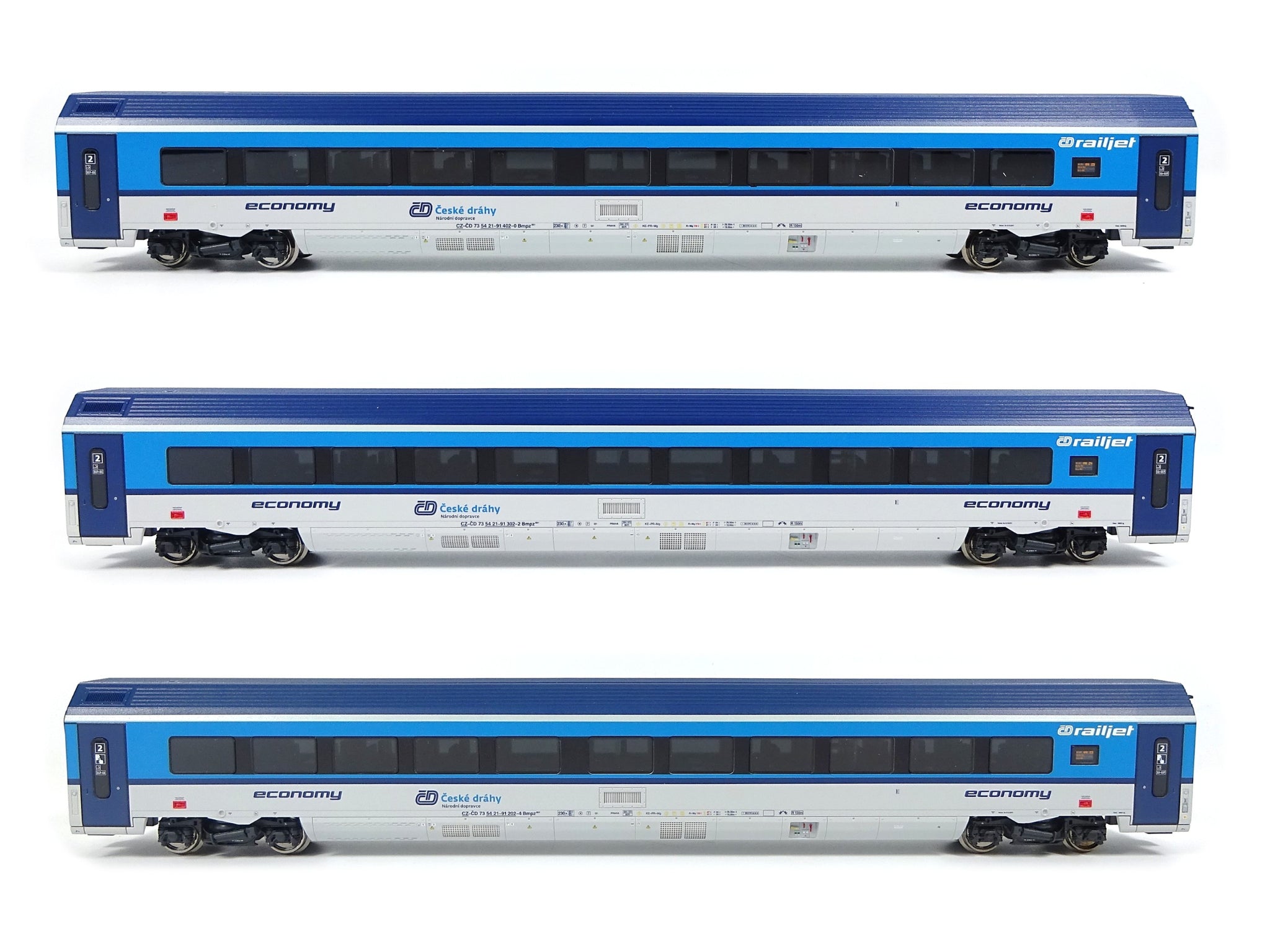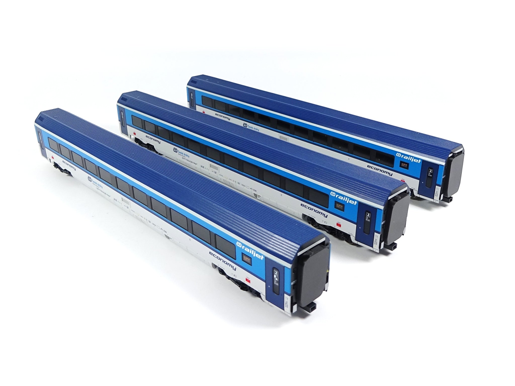 Dreiteiliges Railjet-Wagenset der Tschechischen Staatsbahnen. Bestehend aus drei Economy-Class-Wagen. Epoche VI