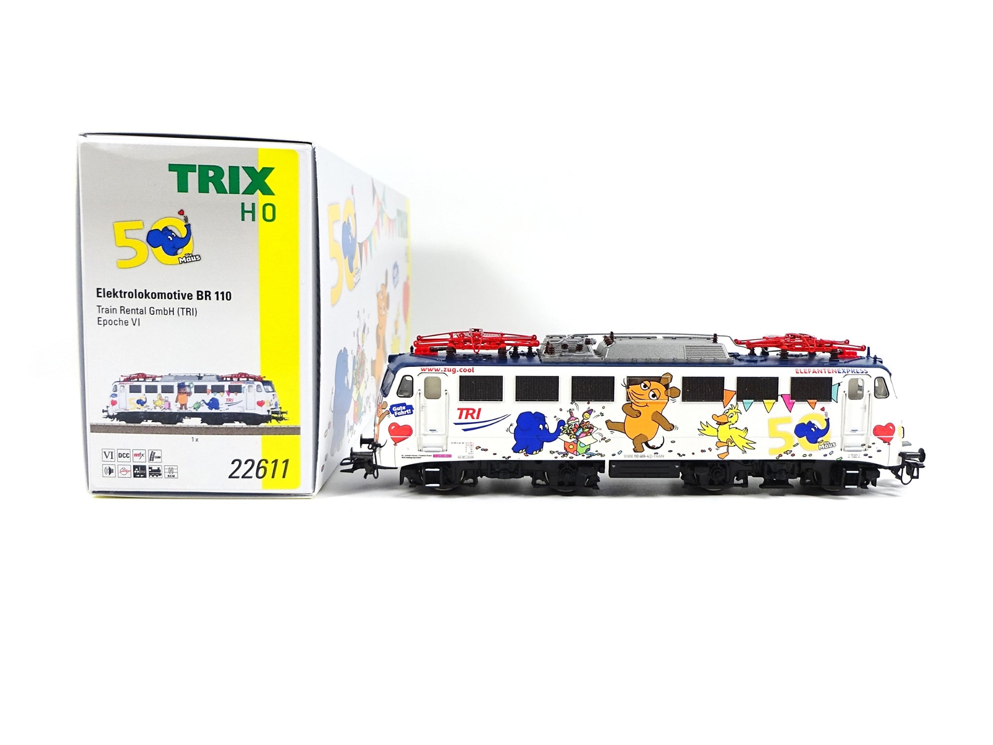 Vorbild: Elektrolokomotive Baureihe 110 der Train Rental GmbH (TRI). Lokkasten mit aerodynamischer Front, der sogenannten Bügelfalte, mit rechteckigen Klatte-Lüftergittern und Maschinenraumfenstern. Betriebsnummer 110 469-4. Betriebszustand ab Januar 2025 in auffälliger Gestaltung als "Elefantenexpress". Epoche VI